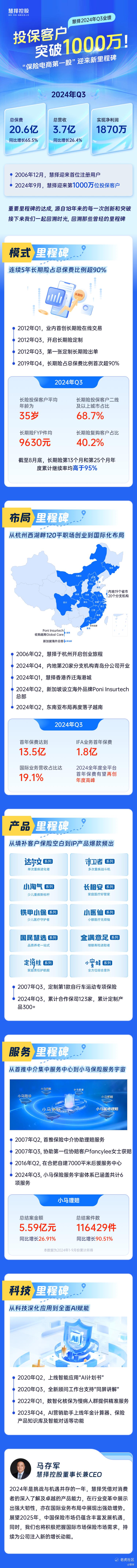 12月10日,国内头部保险电商服务平台慧择(HUIZ.US)于美股开盘前发布2024年第三季度(以下简称“Q3”)未经审计业绩报告。数据显示,Q3期间慧择全平台促成总保费20.6亿元(人民币,下同),总营收3.7亿元,实现净利润1870万元。