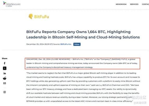 12月5日上午10点左右,比特币价格突破10万美元。当天,一家今年刚在纳斯达克上市的挖矿企业BitFuFu(NASDAQ: FUFU)宣布已经持有1664个比特币。根据Bitcoin Treasuries的数据,这个持币量可以在全球上市公司中排到第15位。这个排行榜中的前15名中仅有2家非欧美公司,其中Nexon公司是韩国的一家游戏制作公司,而BitFuFu则是亚洲持币最多的挖矿上市公司(此前BitFuFu持币数未受到关注,未进入Bitcoin Treasuries数据榜单)。