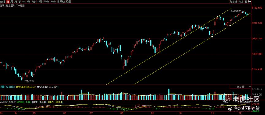首先,标普500目前还处于上升趋势中,并没有跌破支撑位。