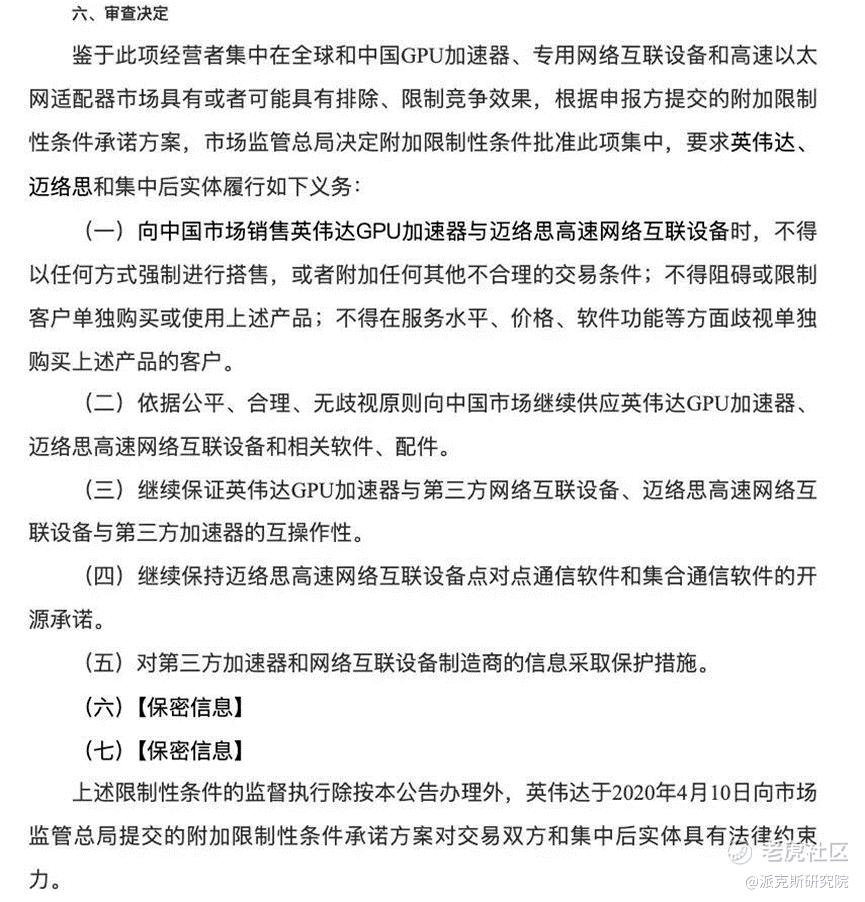 不过我们是有条件的。那就是我们要求达子在收购交易完成后六年内,依据公平、合理、无歧视原则向中国市场继续供应英伟达GPU加速器、迈络思高速网络互联设备和相关软件、配件。