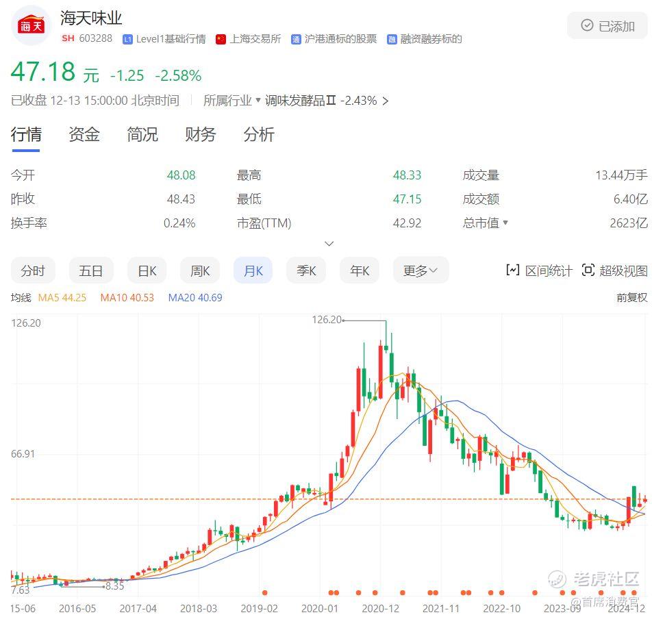 2014年2月,海天味业在A股上市,截止到12月12日收盘,股价为48.43元/股,市值达2693亿元,接近2700亿元市值,比起巅峰时期已经蒸发掉超4000亿元。