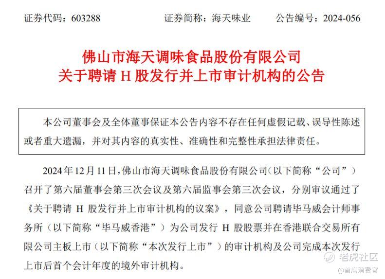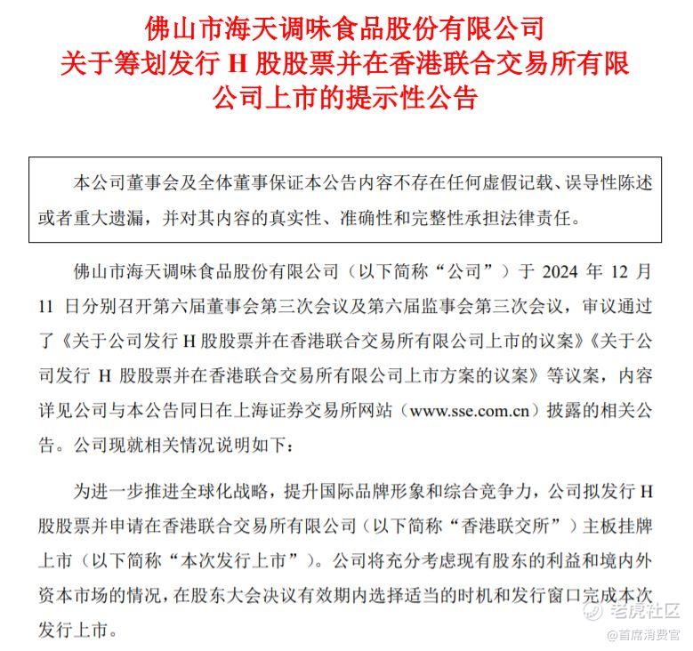 12月11日晚,海天味业的一纸公告,终于将算是将这件事确定了下来。公告显示,海天味业拟发行H股股票上市的相关议案,已通过董事会和监事会审议,待经股东大会程序后将会择时上市。看样子港股上市已经是箭在弦上的事情了。