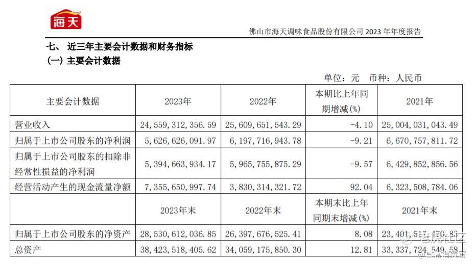 2022年,海天味业扣非净利润同比下降7.09%,2023年更是出现了上市十年来首次营业下滑的情况,营收下降4.1%,为245.59亿元;净利润下滑9.21%,为56.27亿元,已经连续2年负增长。