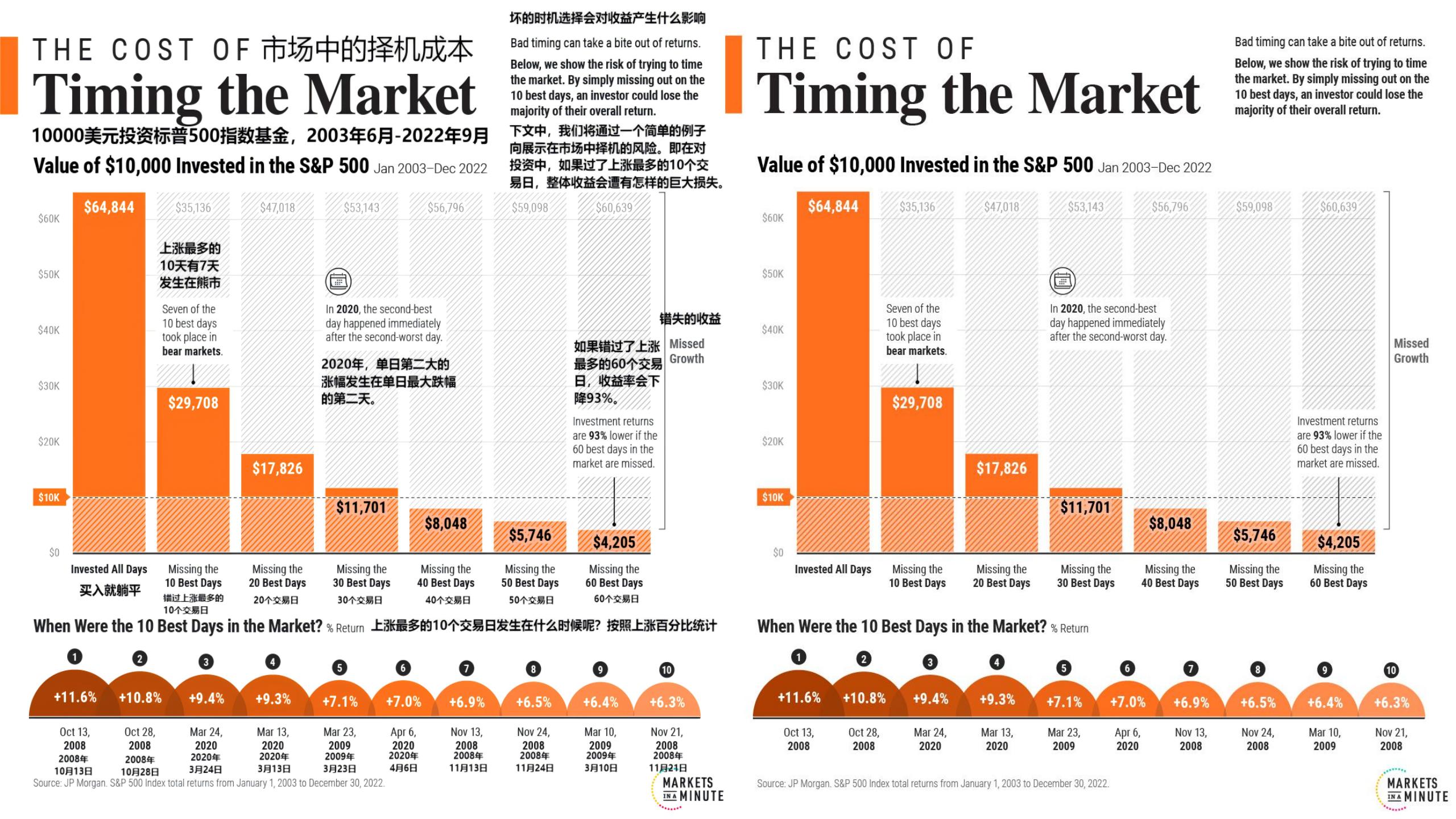 4、大多数人在面对风险的时候会选择离开。但是我们不会这样做,因为风险只是暂时的,下跌是上涨必要的过程,美股长期大牛市的格局并没有改变。躲过下跌也可能错过上涨,然而错过上涨的代价太大。我自己的桌面就是市场择时图,统计区间为2003年-2022年,交易方式为$10000元投资标普500。