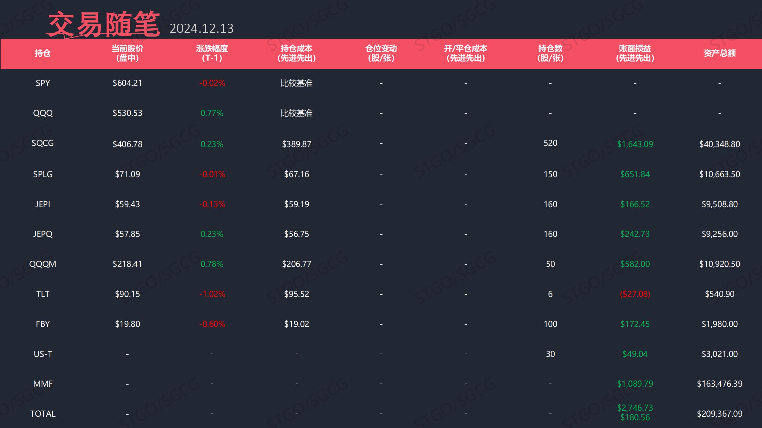 1、SPY/QQQ涨跌互现,SPY震荡收跌,QQQ延续上涨,SQCG略优于大盘。