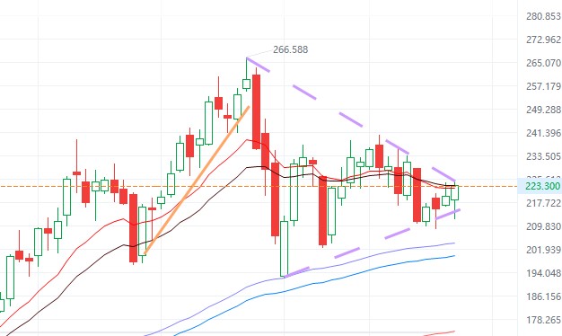 以周线看,SOXX先跌后拉升,收阳线似想突破。未来几天升穿225,就形成新的上升势头。不过都是再看看下周出业绩的美光表现。