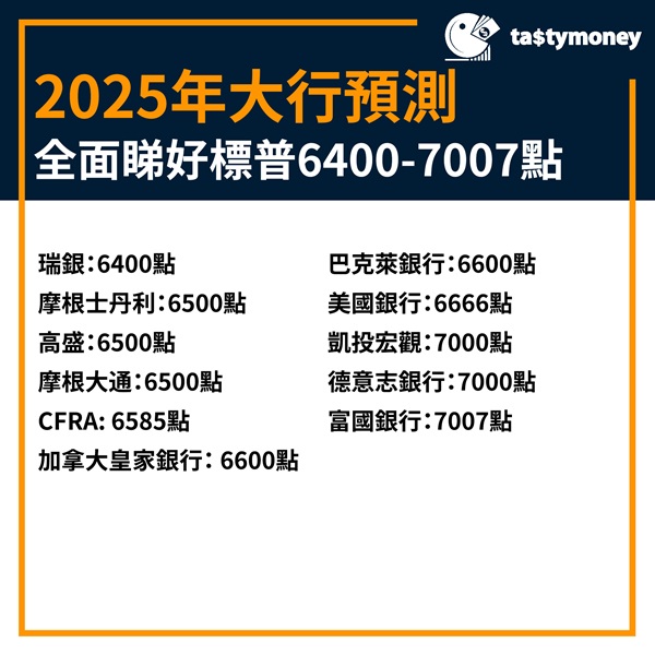 华尔街大好友Tom Lee 仍看好 2025 年股市将上涨,但涨幅远不及 2023 年或 2024 年。Tom Lee 指明年标普 500 指数年中冲上7000点,年底目标回落至6600点。Tom Lee 预估标普升18%,与历回报率差不多。