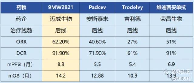 以尿路上皮癌适应症为例,9MW2821在免疫检查点抑制剂及铂类基础治疗失败的37例患者中取得ORR和DCR分别为62.2%、91.9%,mPFS为8.8个月,mOS为14.2个月。而竞品Padcev在针对免疫检查点抑制剂及铂类基础治疗失败的尿路上皮癌患者EV-301研究中,取得了ORR为40.6%、DCR为71.9%、mPFS为5.5个月和mOS为12.88个月的成绩。