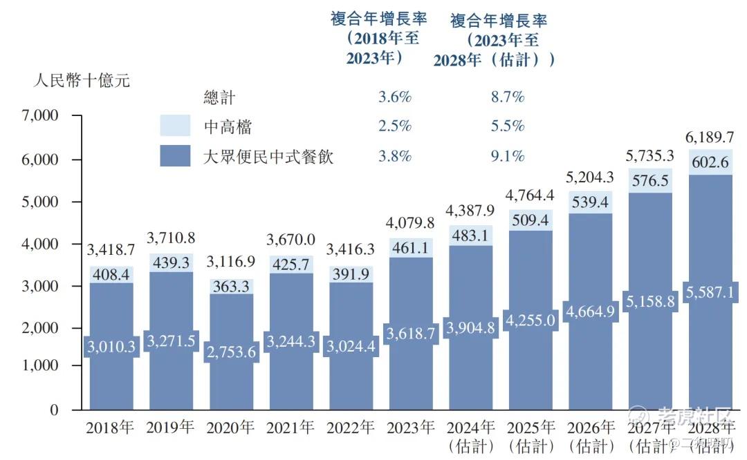 大众便民中式餐饮市场的市场规模(按收入计)由2018年的人民币30103亿元增长至2023年的人民币36187亿元,即2018年至2023年的复合年增长率约为3.8%。
