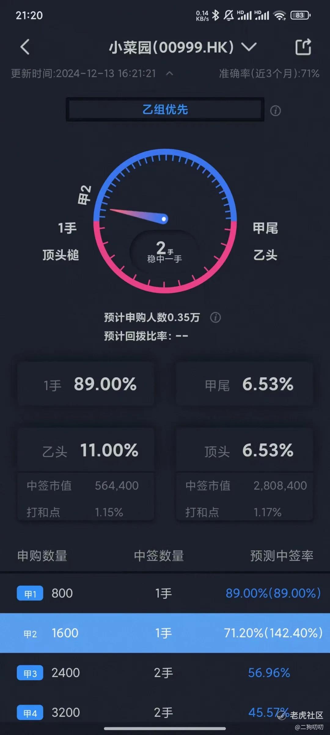 香港公开发售1011.84万股,每手800股,合计12648手,目前孖展不足额,但是应该不会超过15倍,不回拨,那么甲乙组各获6324手,按照4000人申购,预计1手中签率在70%-100%。。。