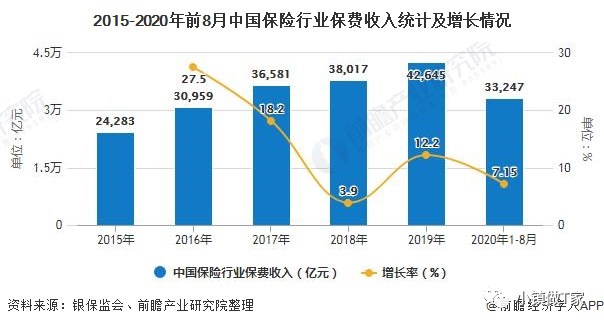 2015-2019年,我国保险行业保费收入逐年增长,其中2019年保费收入达到42645亿元,同比增长12.2%。截止至2020年1-8月,我国保险行业保费收入达到33247亿元,同比增长7.15%。