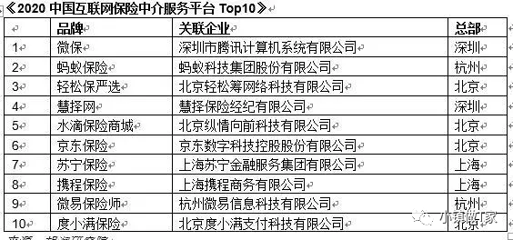 号称全球保险电商第一股的慧择,在行业中处于什么地位呢?2020年,胡润百富发布了年度互联网保险中介服务平台Top10。详细列举了目前互联网保险中介平台,并对他们做了排名:
