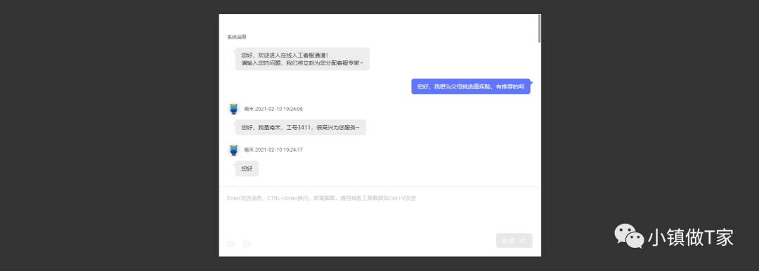 为了更好地了解慧择的服务,我点击了慧择页面右侧的客服入口,在弹出的对话框中输入我的诉求,然后慧择的在线客服几乎是秒回: