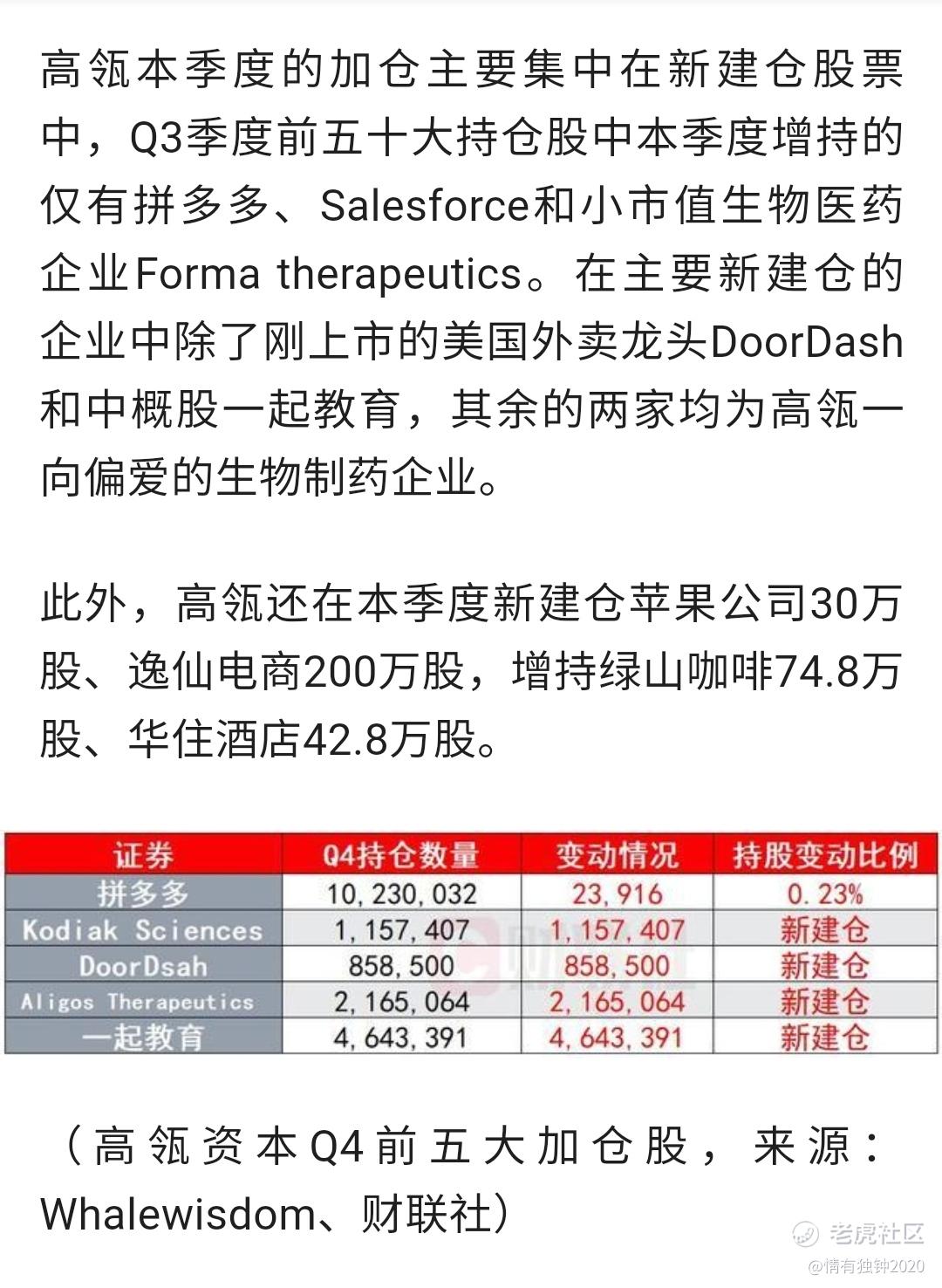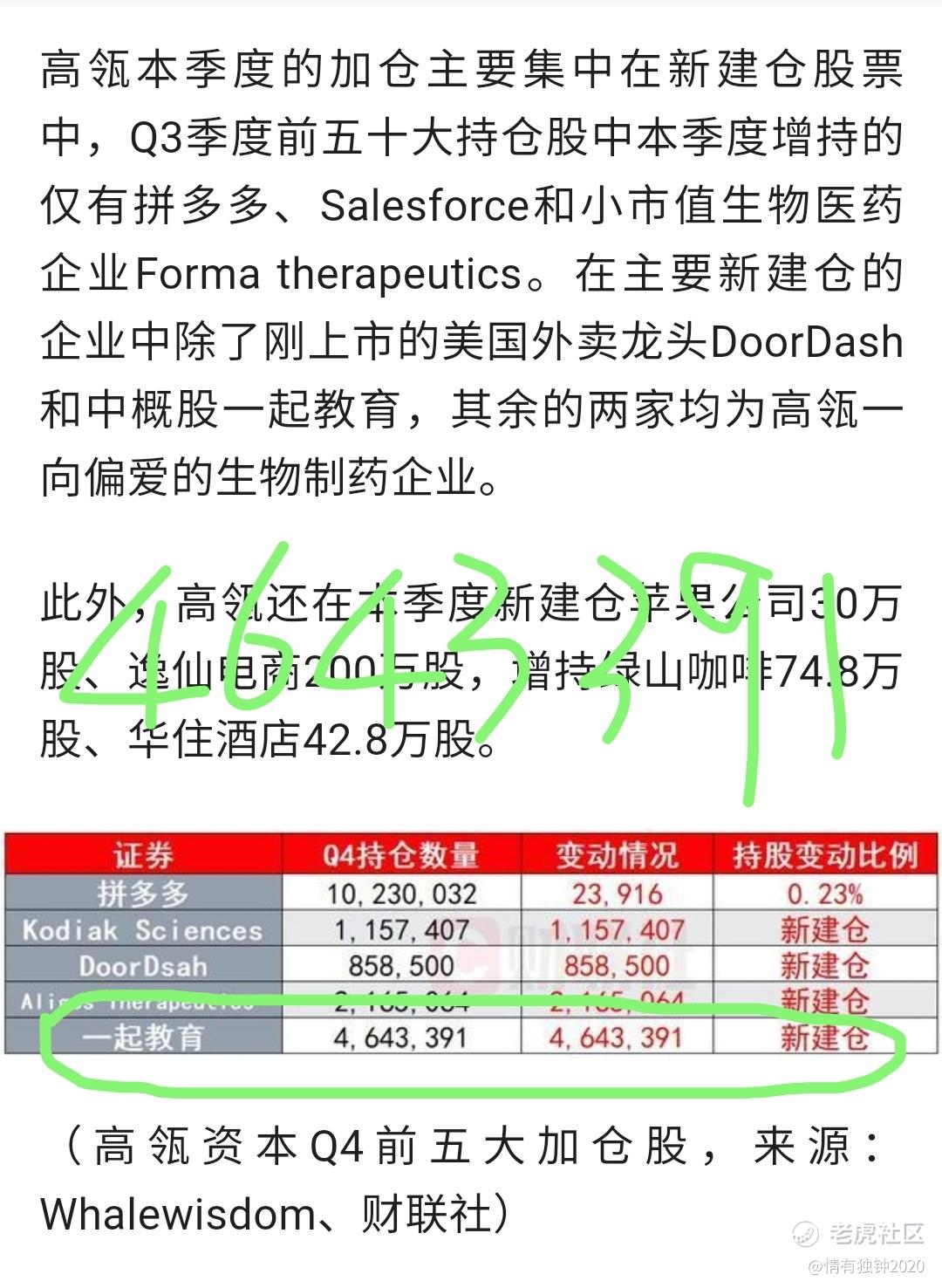 根据新浪网 财联网最新咨询 高瓴资本Q4最新建仓一起教育4643319股 一起教育流通股一共2740万股 高瓴资本增持464.33万股 占流通股17% 占总股本约2.1%(达不到5%向SEC披露的要求)