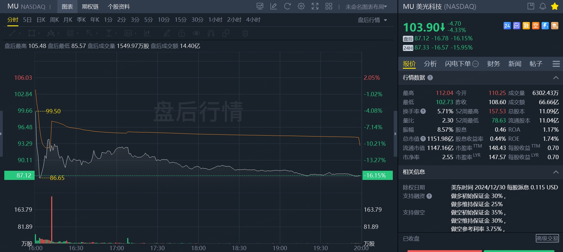 但因FY25Q2业绩指引不及预期,盘后股价暴跌16%: $美光科技(MU)$