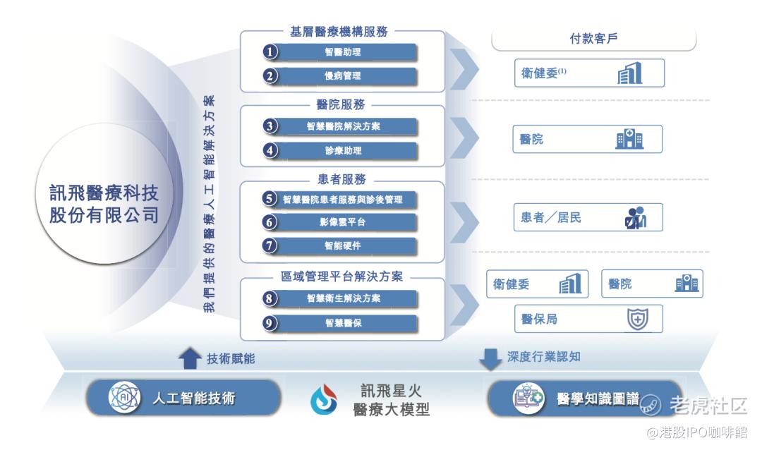 讯飞医疗是一家人工智能赋能的医疗解决方案提供商,提供的产品及解决方案支持从健康风险预警、早筛、辅助诊断及治疗,以及治疗效果评估到诊后管理与慢病管理的多种医疗服务。根据弗若斯特沙利文的资料,讯飞医疗2023年的收入规模在中国医疗人工智能行业中排名第一,市场份额为5.9%。科大讯飞(一家专注于核心人工智能技术研发的领先人工智能公司)为其控股股东。