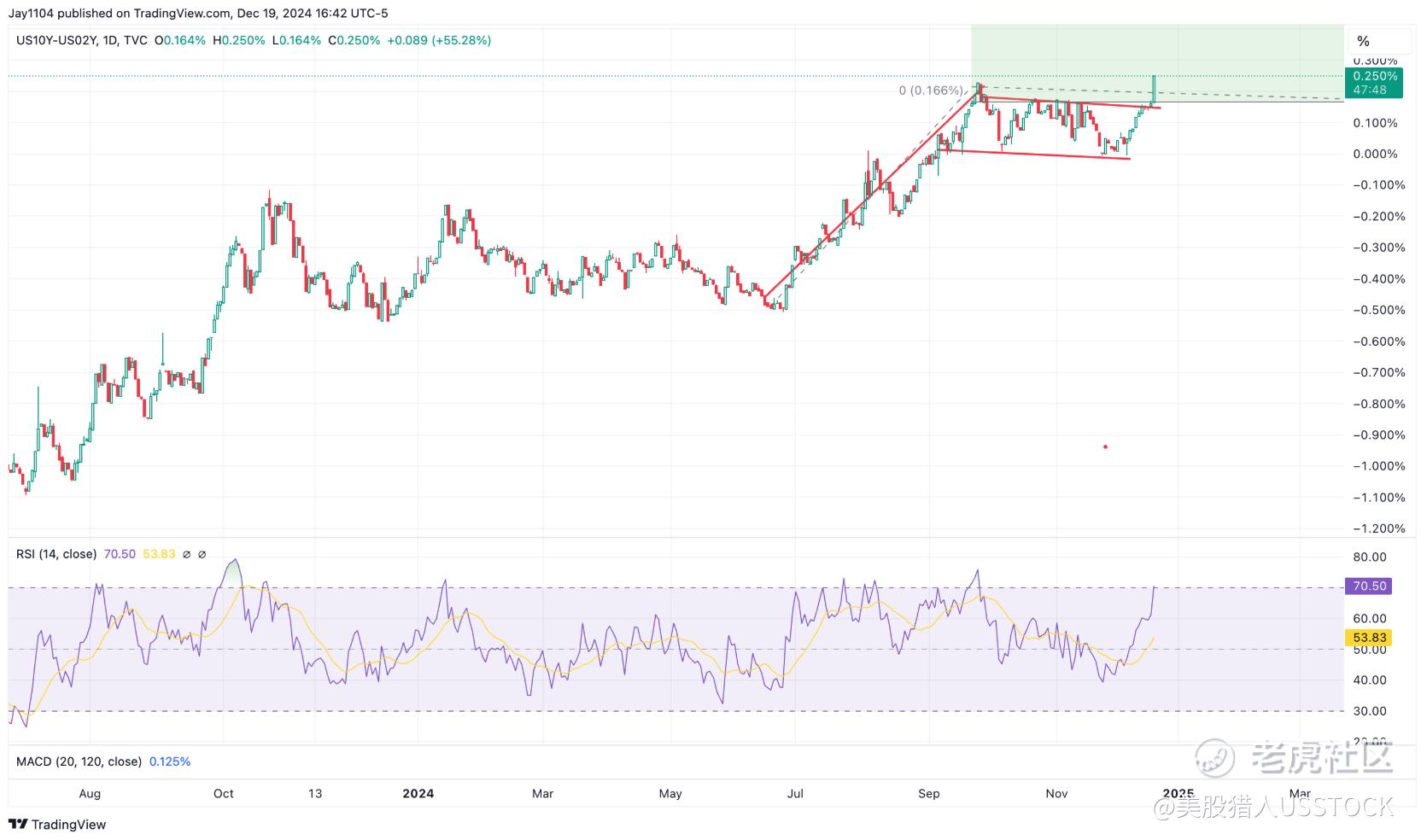 10 年期国债收益率上升5 个基点至 4.57%,30 年期国债收益率上升 6 个基点至 4.74%。这使得收益率曲线趋于陡峭化,10-2 利差增加 10 个基点至 25,突破了牛旗形态。