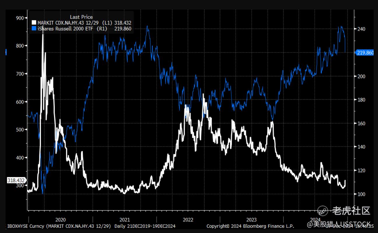 市场广度仍令人担忧,小型股表现不佳。昨天,IWM又下跌了 44 个基点,与信用利差扩大一致。CDX 高收益信用利差指数上涨 5 点至 318,表明随着信用利差扩大,小型股可能会进一步陷入困境。从历史上看,小型股与信用利差的相关性比名义利率或实际利率更高。