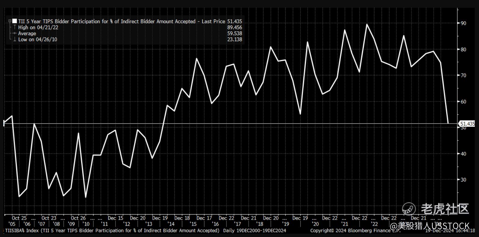 昨日的5年期TIPS拍卖表现尤其疲软,投标倍数为2.1,低于之前的2.4,间接参与率仅为51.4%,为2013年以来的最低水平。这推高了实际收益率,5年期实际收益率上涨5个基点至2.09%,10年期实际收益率上涨7个基点至2.26%。