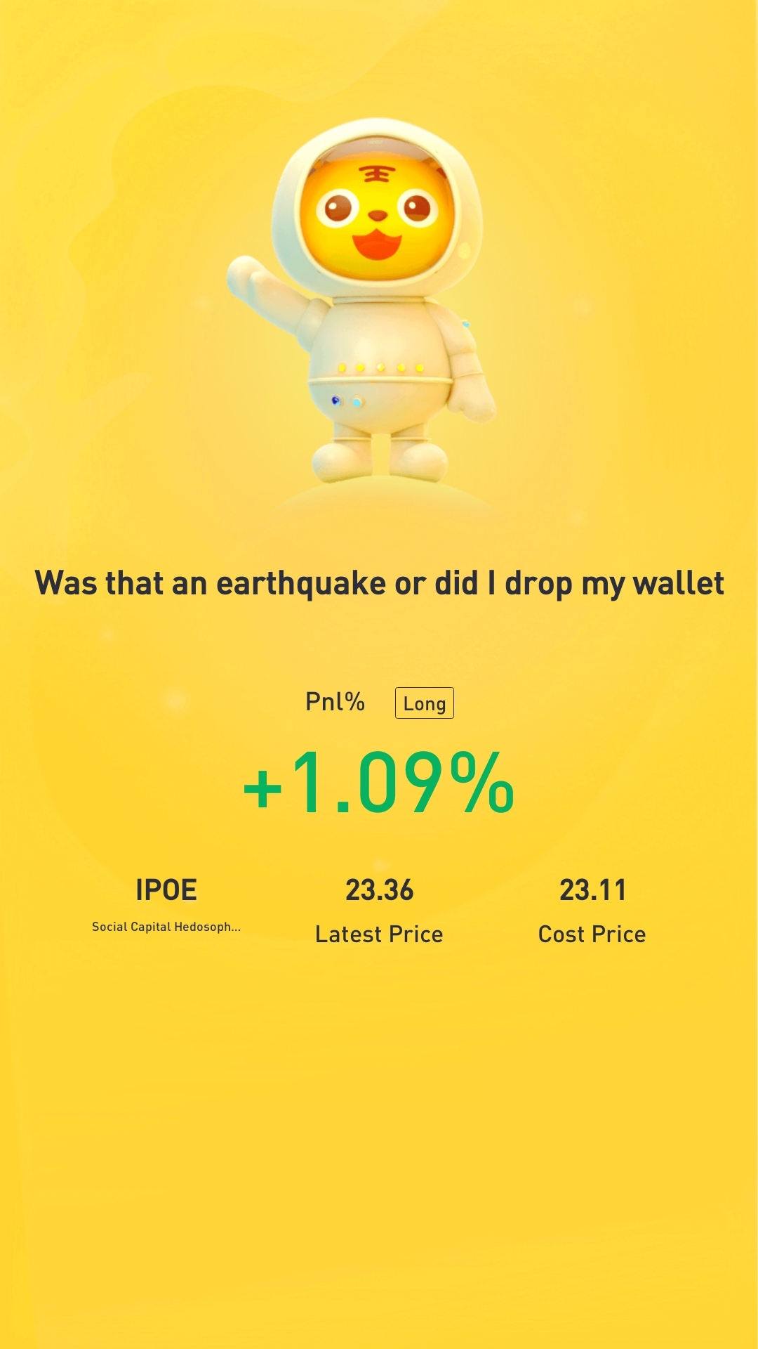 $Social Capital Hedosophia Holdings Corp. V(IPOE)$建仓成功!!!感谢大盘下跌,让小弟我有机会上车,下次就在$19左右加仓,希望可以在月尾加仓。如果资本足的话我已经在卖期权漂权利金了,看来需要更加努力地挣钱了。在此也欢迎各位股友分享你们的目标价格以及原因,我也想知道我漏看了什么。[思考]