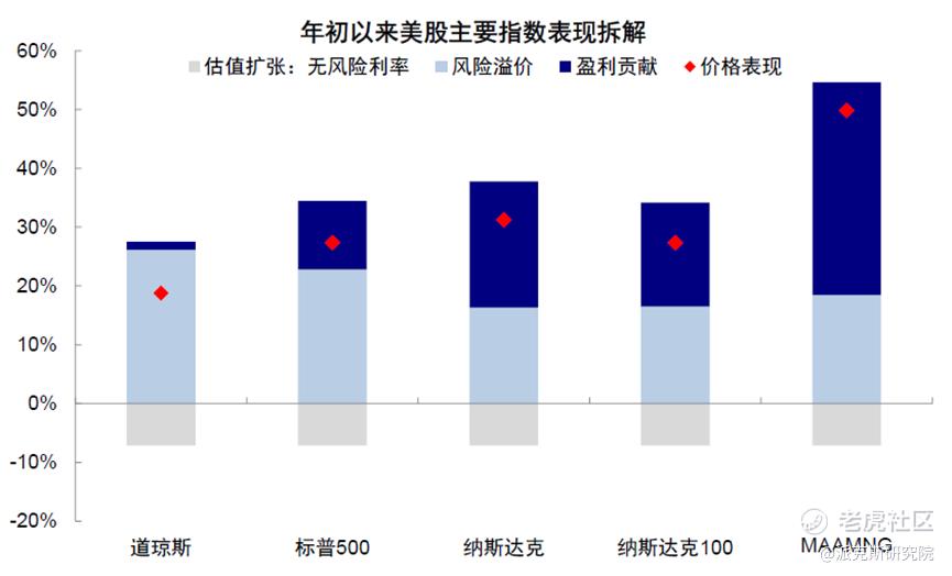 根据中金的测算,纳斯达克年初至今的涨幅中有约68%是由盈利贡献的,MAAMNNG(科技龙头指数)的盈利贡献比例更高,达到了73%。