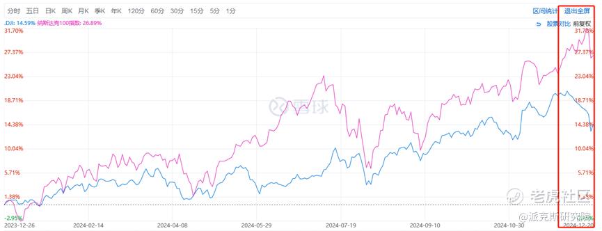 这是道琼斯指数与纳指100的走势叠加图,二者很明显在近期走出了背离。