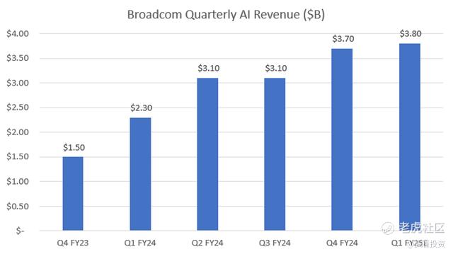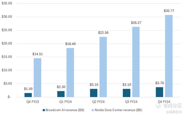 另一方面,博通本季度的收入略低于预期,第一季度的预期仅略高于市场普遍预期。人工智能收入为 122 亿美元,仅比管理层第三季度预测的 120 亿美元高出 2 亿美元;这与 Nvidia 一季度又一季度持续保持的惊人增长并不完全一致。