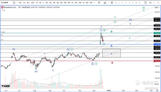 绿色 – AVGO 将处于标准的 5 波模式,并且仅处于 3 波中的第 4 波。这意味着它应该在 212.50 美元上方找到一个低点,然后至少再波动 2 次至新高。这是对价格走势最乐观的解释,应该会看到持续的上升趋势到 2025 年。