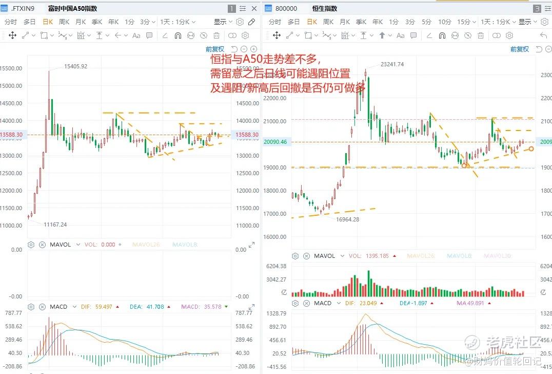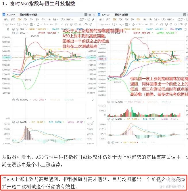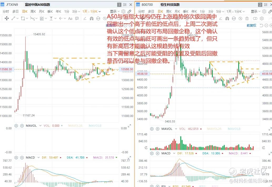 从截图可看出,A50与恒生科技指数日线图整体仍处于大上涨趋势的宽幅震荡回调中,近期在震荡中是个小上涨趋势,