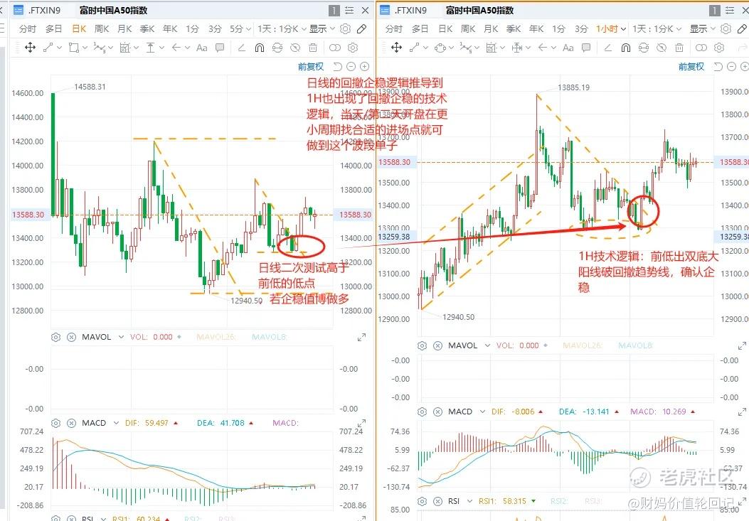 这意味着日线回撤企稳做多的趋势逻辑,推导到1小时回撤企稳的技术逻辑也出现了,