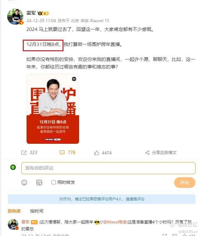电车界12月29日讯,小米汽车创始人雷军今日发布微博称,将在12月31日晚8点开启一场“围炉跨年直播”。