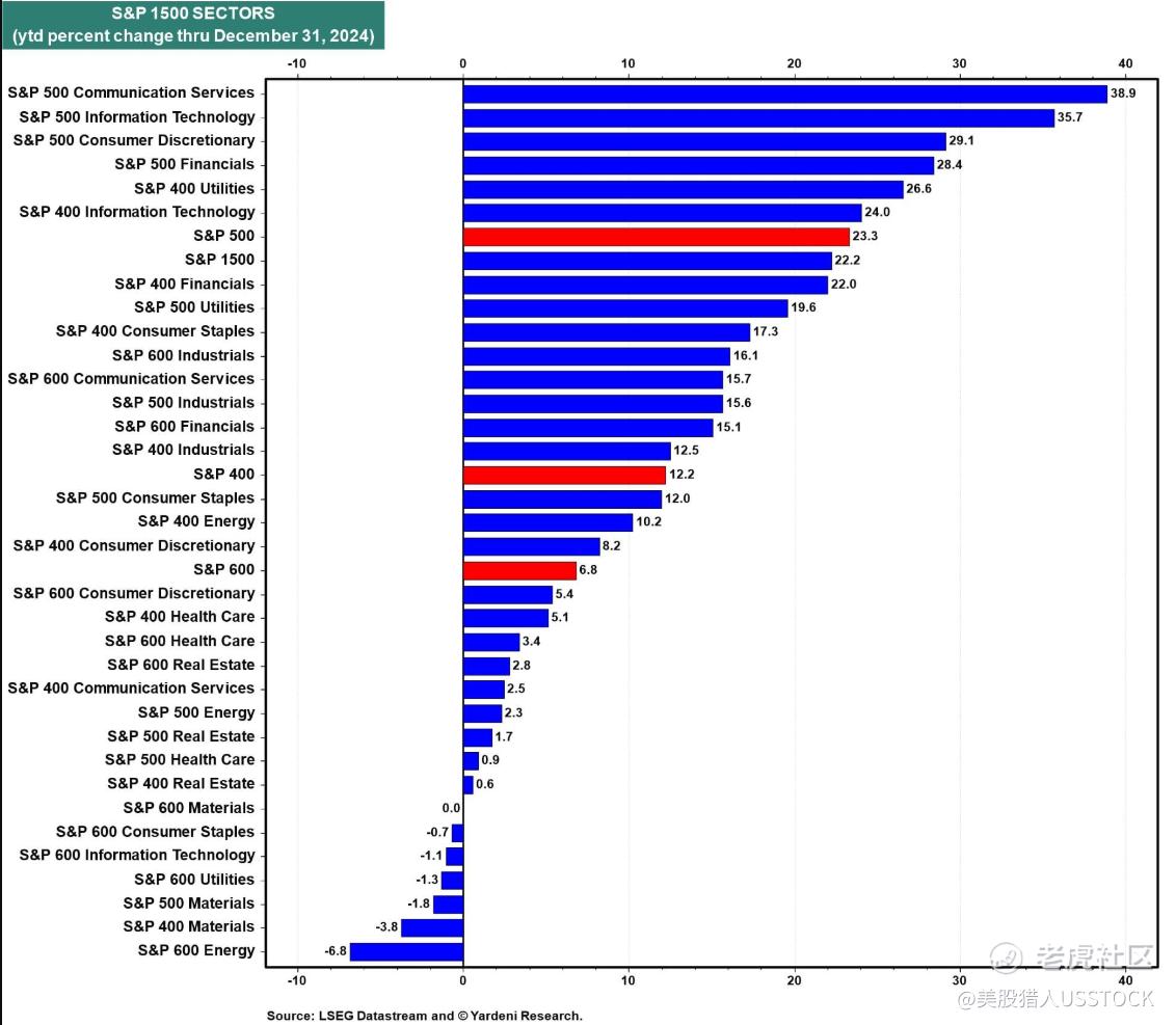 2024 年,标普 1500 指数表现优异的股票板块主要由大型成长股主导,尤其是 Mag-7(图表)。然而,标普 500金融股和标普 400公用事业股成功击败了标普 500 指数。此外,标普 400 指数和标普 600 指数的预期收益自 2022 年以来一直持平。