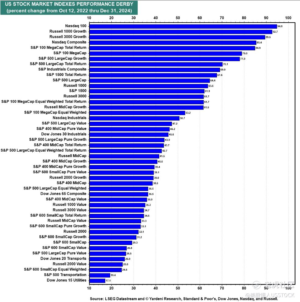 自 2022 年 10 月 12 日牛市开始以来,美国 MSCI 股票价格指数一直是少数几个跑赢全球 MSCI(以美元计)的指数之一(图表)。预计它将在 2025 年继续表现出色。