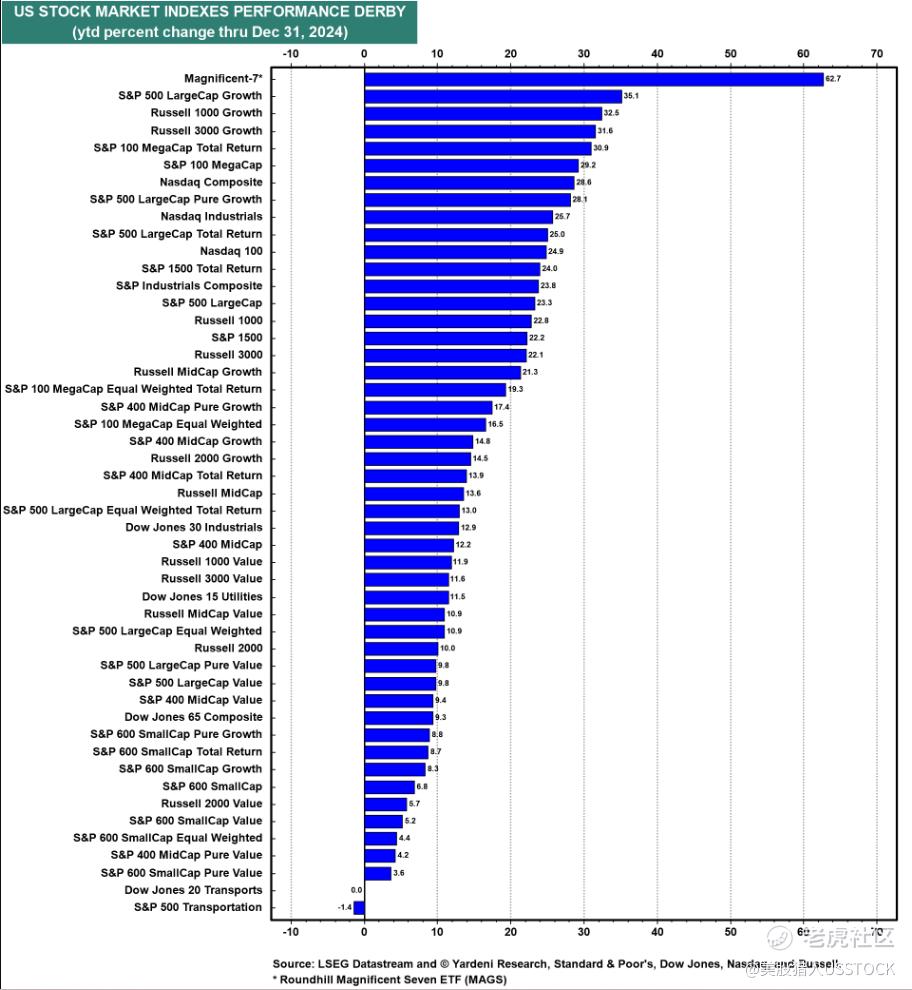 去年的涨势在很大程度上受到七大股指的影响,七大股指合计飙升 62.7%,目前占标准普尔 500 指数市值的 32%(图表)。它们很可能会在年初继续表现出色。我还认为纳斯达克指数将在 2025 年表现出色。虽然我认为股市可能会在新年伊始出现大幅回调,但预计一旦货币和财政政策变得更加明朗,牛市将从春季开始再次扩大。