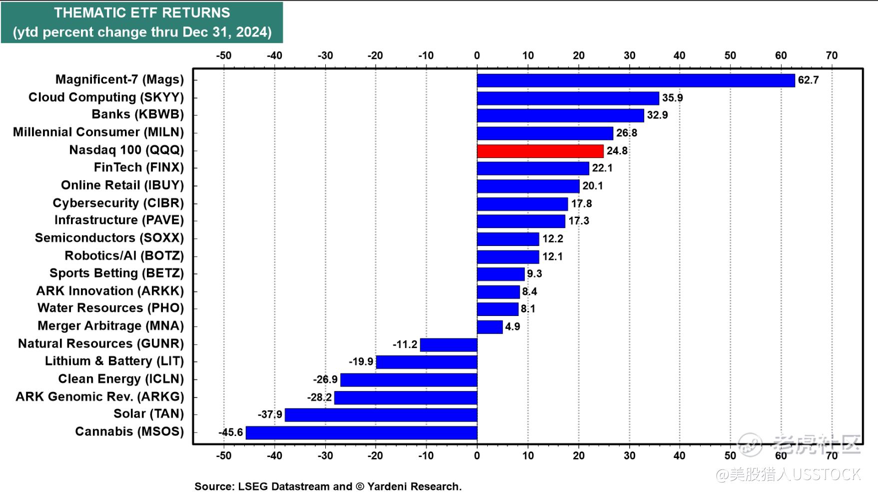 在主题 ETF 中,今年表现优异的是 Mag-7 和其他专注于科技的 ETF。最大的输家是押注清洁能源和大麻的 ETF。预计 2025 年的情况也是如此。