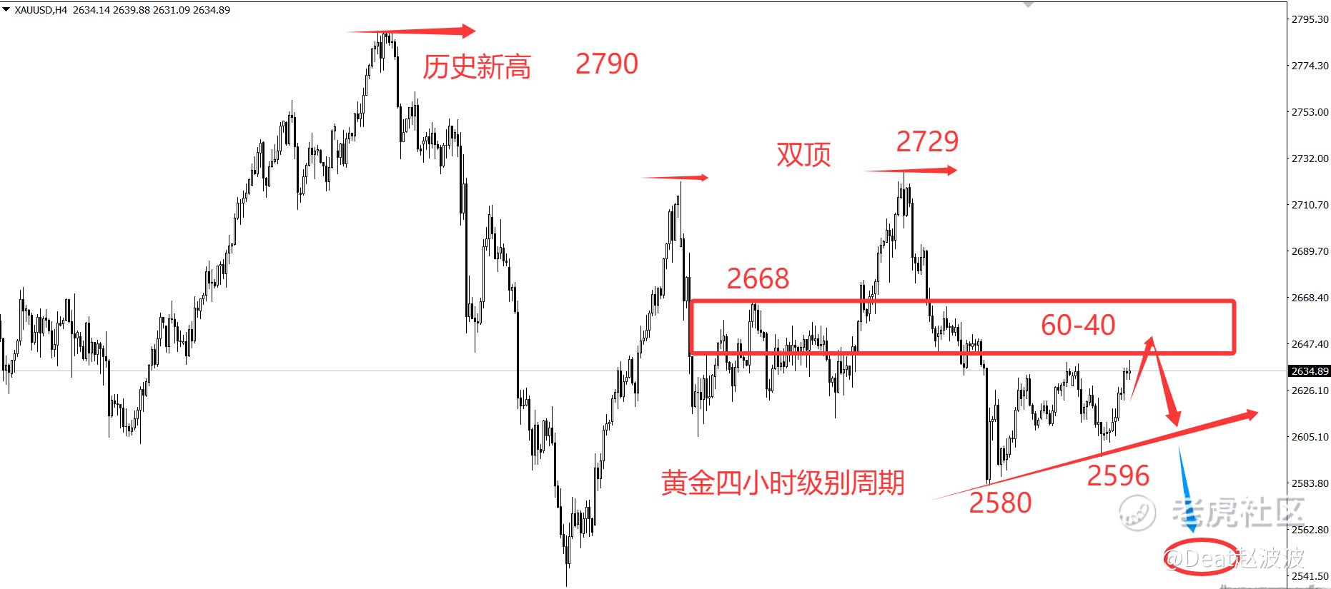 但是目前的日线以及周线级别,整体的盘感走势,依旧是空头情绪大于多头情绪。因为行情在冲击历史新高2790开启下跌,后期的确认行情,也是停步于2729附近(此趋势下也给到双顶的压力结构)。所以说,黄金价格在日,周线级别,依旧呈现空头大于多头的盘感趋势。