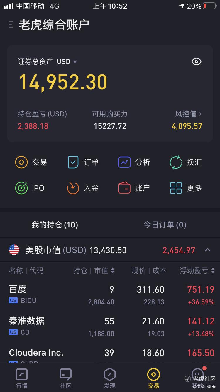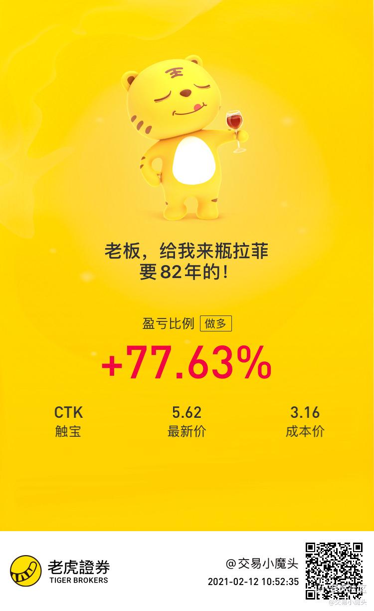 目标100w刀、每日持仓分享。数字货币概念股继续飙,嘉楠科技、第九城市双重概念利好离我卖掉的价格又翻倍了。触宝还是一如既往的给力,百度、触宝继续持有,c3.ai期权几十个点的盈利先下车了,因为自己对该股没有把握。$触宝(CTK)$$哔哩哔哩(BILI)$$C3.ai, Inc.(AI)$