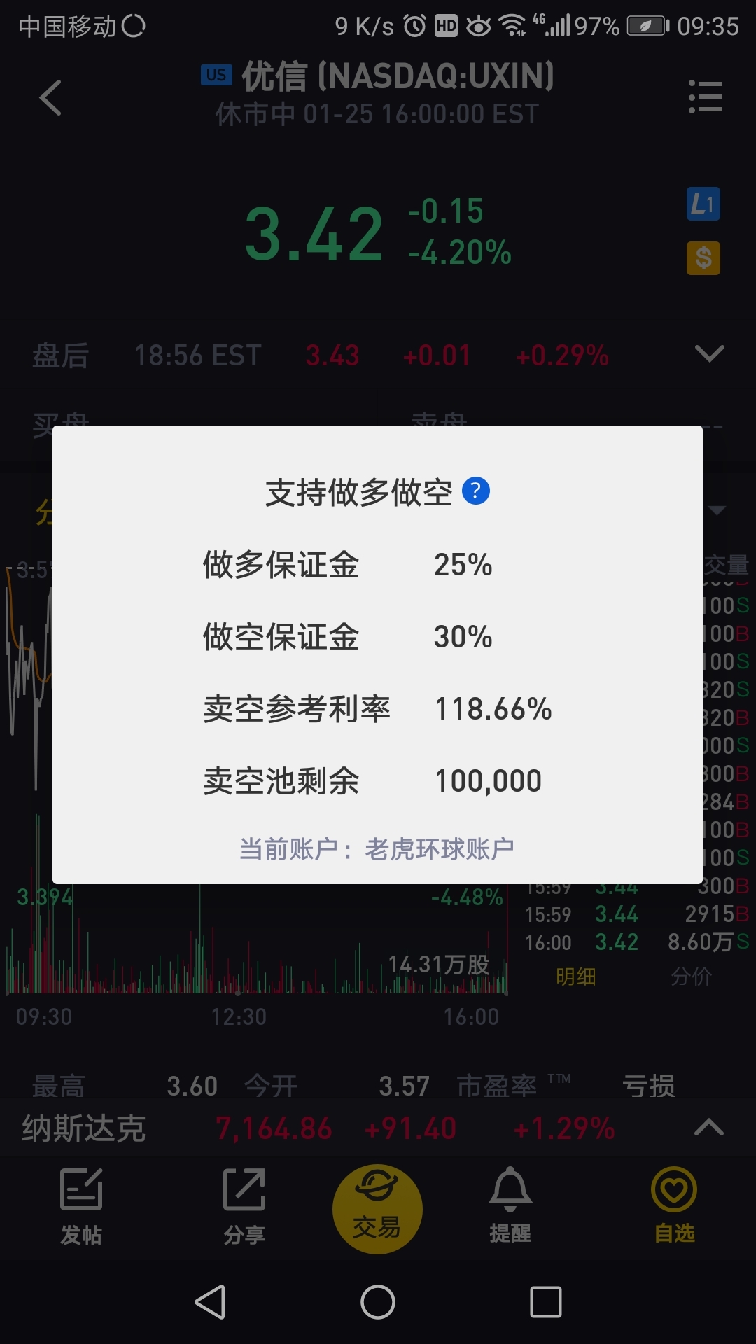 $优信(UXIN)$原来标准账户和环球账户不一样,标准账户不能做空,环球账户可以做空。环球账户卖空参考利率 118.66%,是其他正常票的100倍,有够高的,赶借的不怕赚了钱都给出借的了。