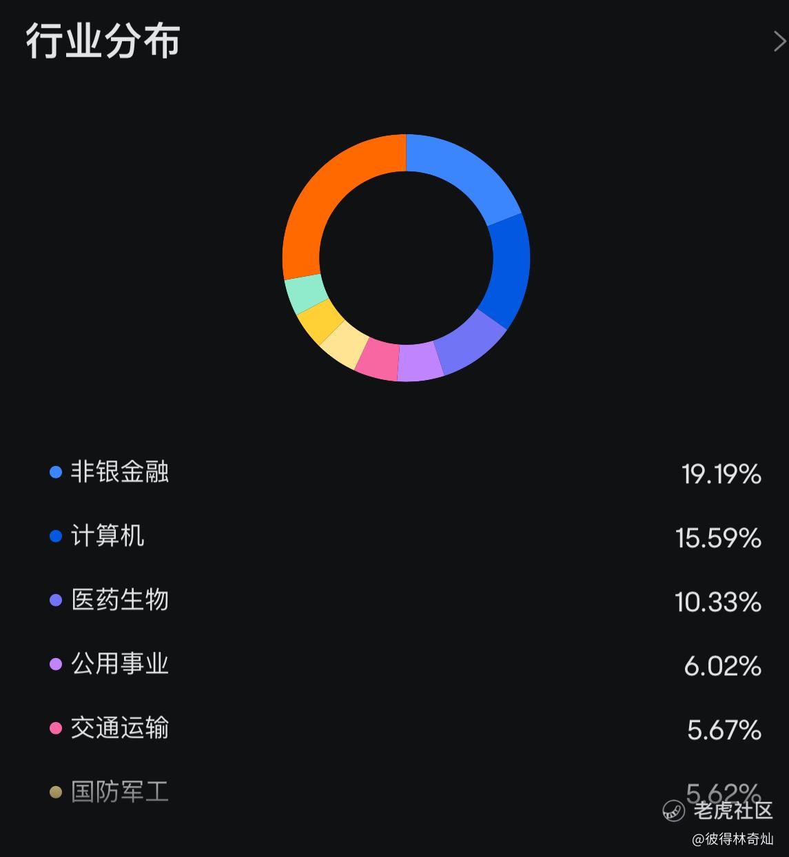 • 非银金融占比最高,为19.19%,非银金融包括券商、保险等金融机构,其收益与金融市场的行情息息相关。