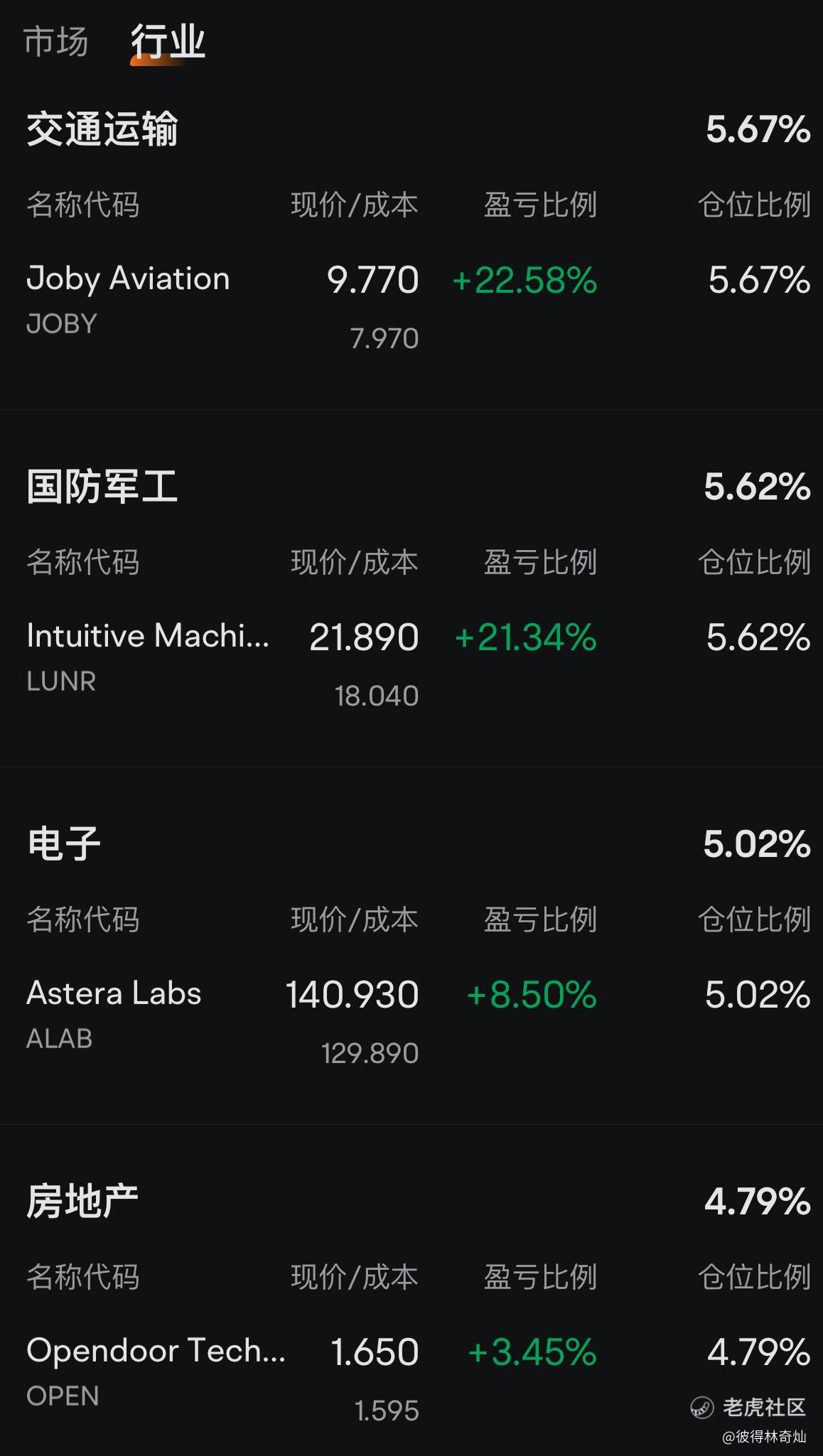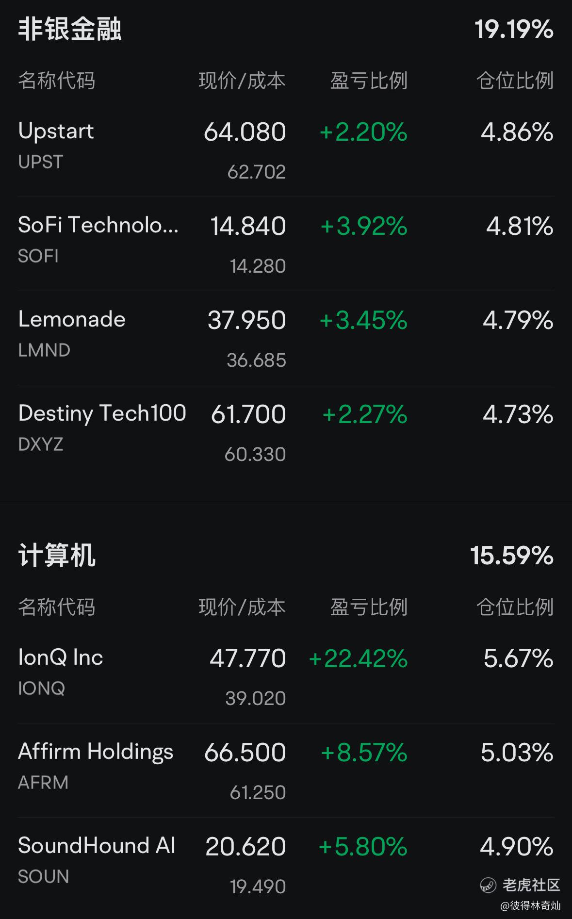 Ginkgo Bioworks(DNA)、Affirm Holdings(AFRM)等股票的盈亏比例在 +8% - +9%之间,仓位比例在5%左右。其他如Astra Labs(ALAB)、SoundHound AI(SOUN)等股票也都有正向收益,只是比例相对较低。