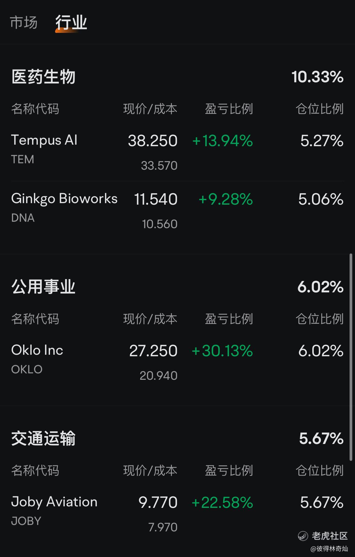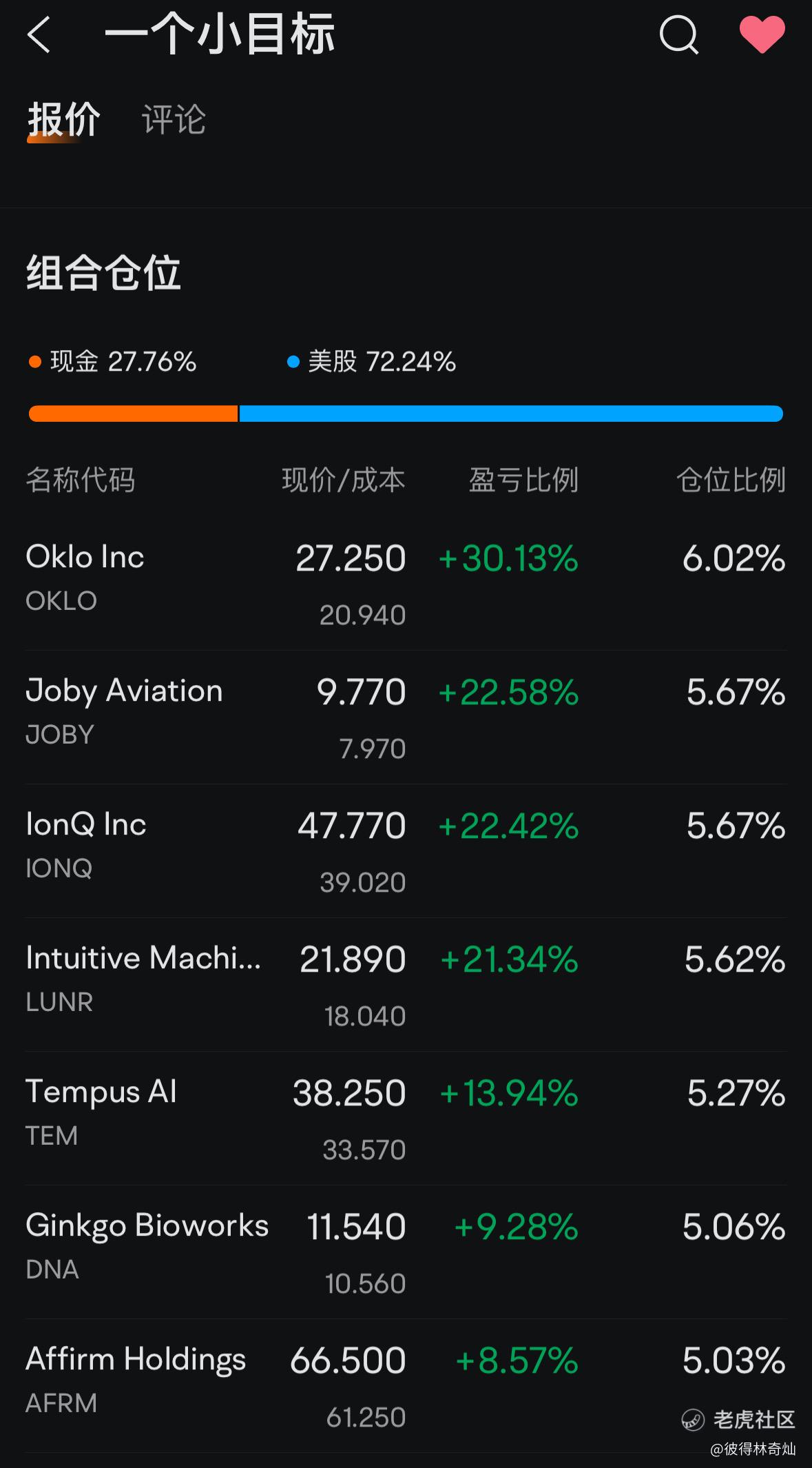 Oklo Inc(OKLO)现价27.250,成本20.940,盈亏比例 +30.13%,仓位比例6.02%,是组合中收益较高的标的之一。Joby Aviation(JOBY)、IonQ Inc(IONQ)的盈亏比例也较高,均在 +22%以上,仓位占比均为5.67%。这些股票为组合贡献了可观的收益。