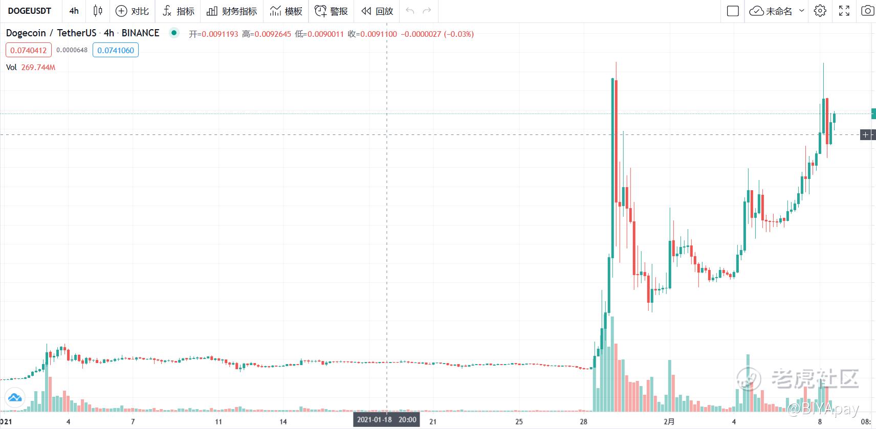 2月4日,马斯克在其推特上提及狗狗币之后,火币的数据显示,DOGE短时拉升日内涨超50%。