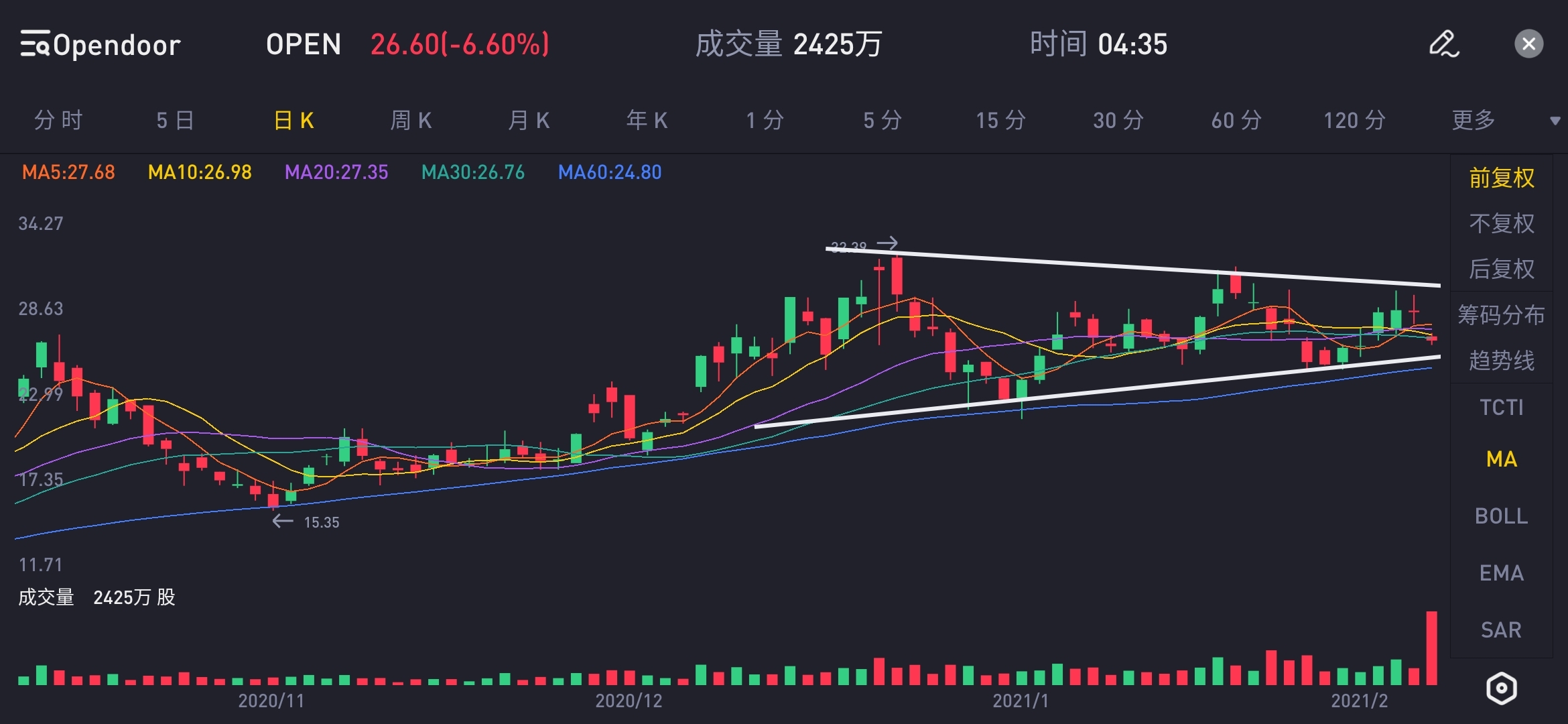 目前Opendoor的股價看起來是一個三角收斂的型態,2月5日open door收到股票增發的消息面影響,股價跳水當日跌幅達6.6%。