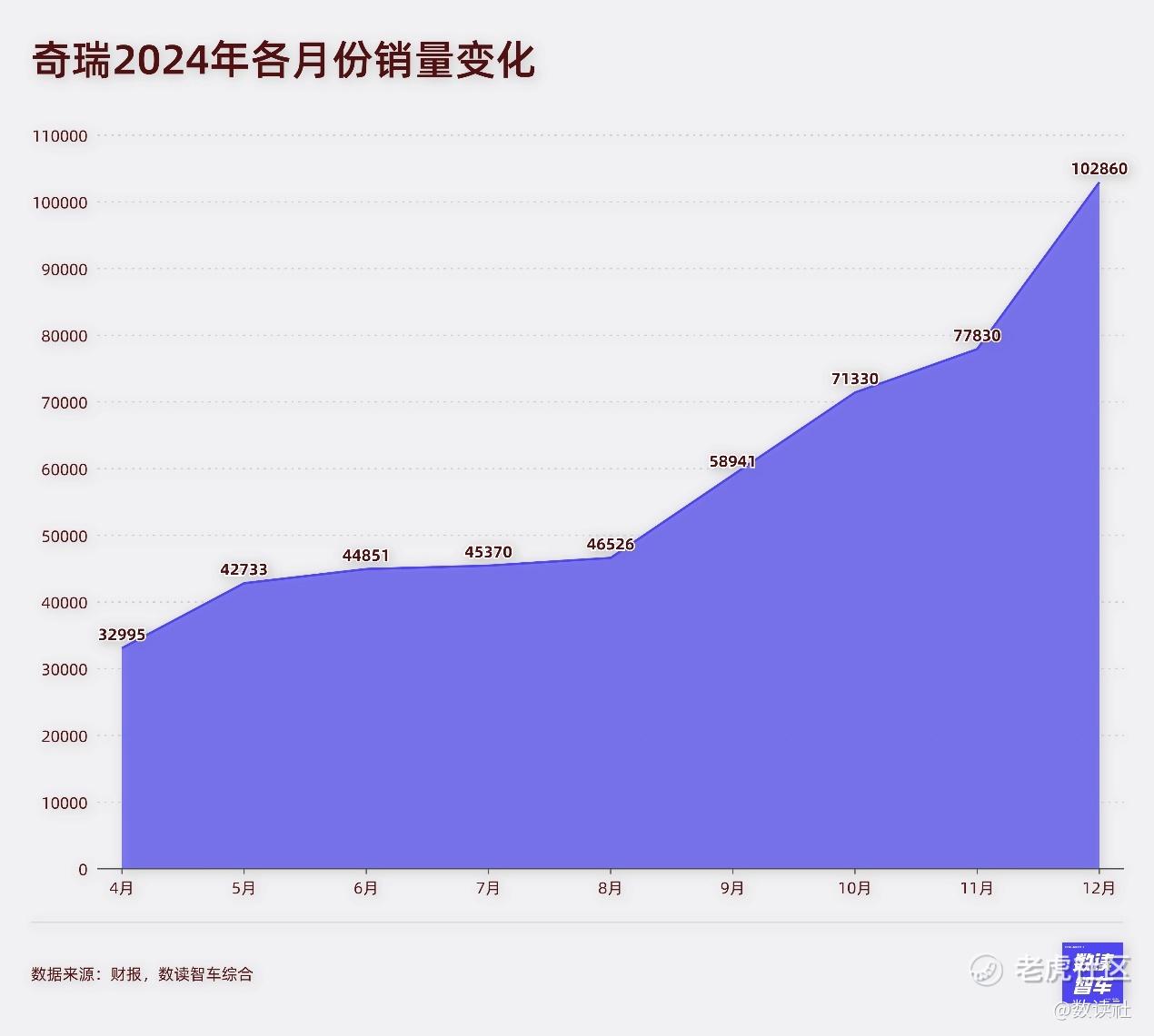 从3月份以来,奇瑞的新能源销量持续增长,从3万台增长到12月份的10万台。
