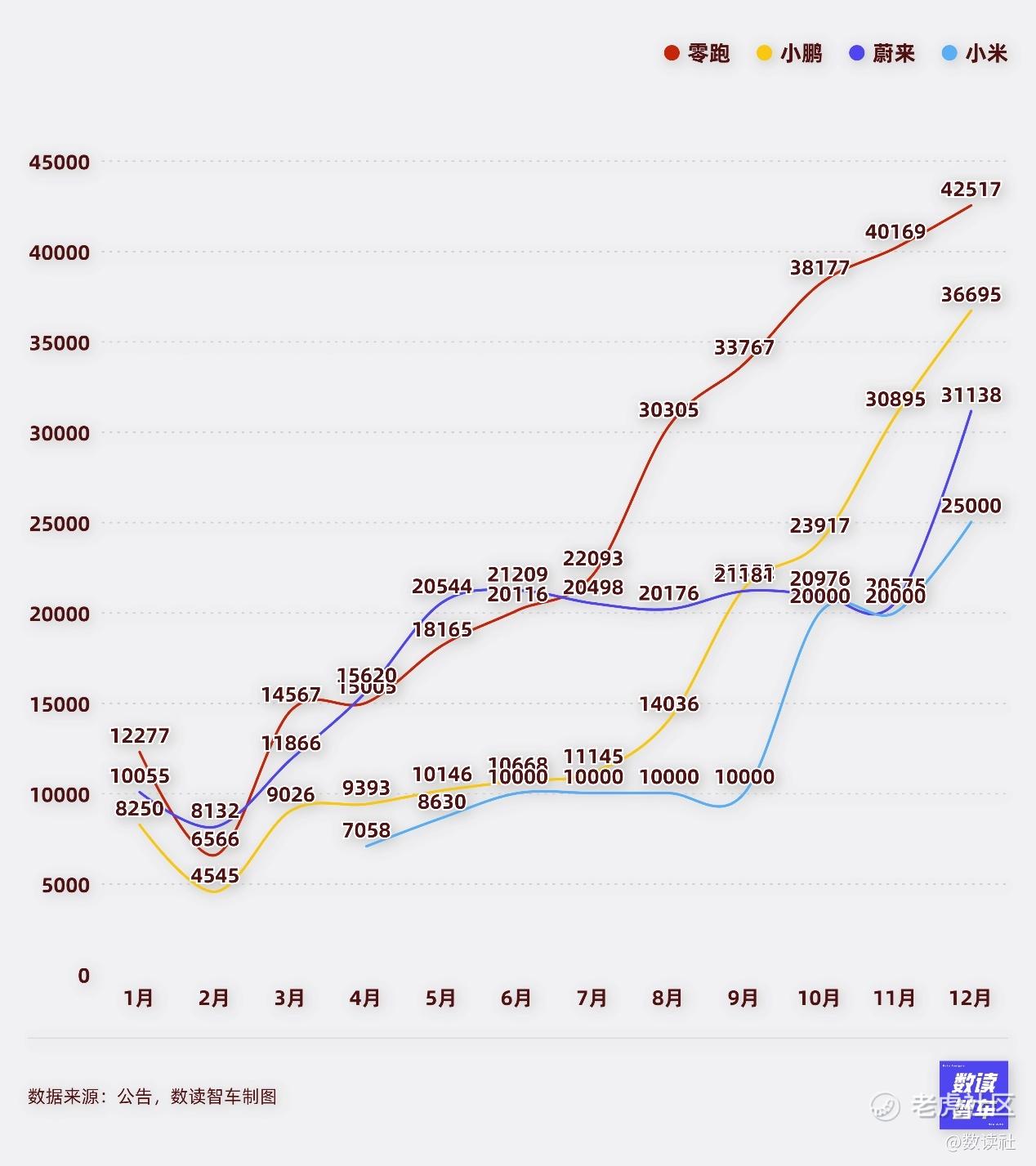 小鹏的交付能力在12月迎来突破。其销量达到36695台,其中,MONA M03交付超1.5万台,推动整体销量直线上升。也印证了低价的威力。