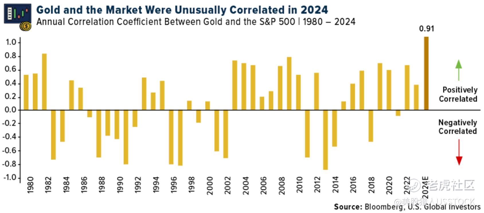 略有不同的是,黄金和标准普尔 500 指数之间的相关性在 2024 年达到了前所未有的 0.91,这意味着这两种资产全年几乎 100% 的时间都是同步变动的。