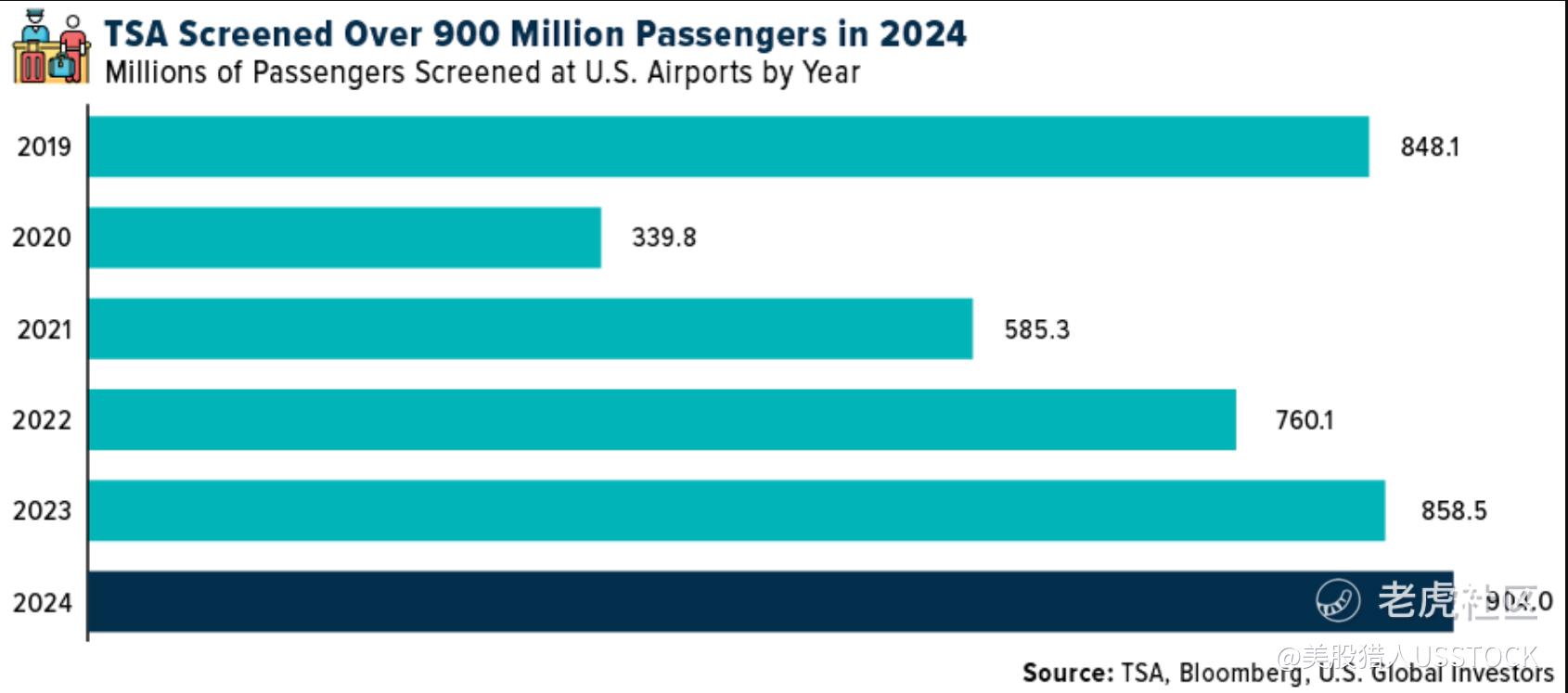 2024 年航空旅行激增,美国运输安全管理局 (TSA) 报告称,美国机场共筛查了 9 亿多名乘客,创历史新高。美联航在 2024 年利用这一趋势,运营了有史以来规模最大的国内航班,并大幅扩展了国际航线。