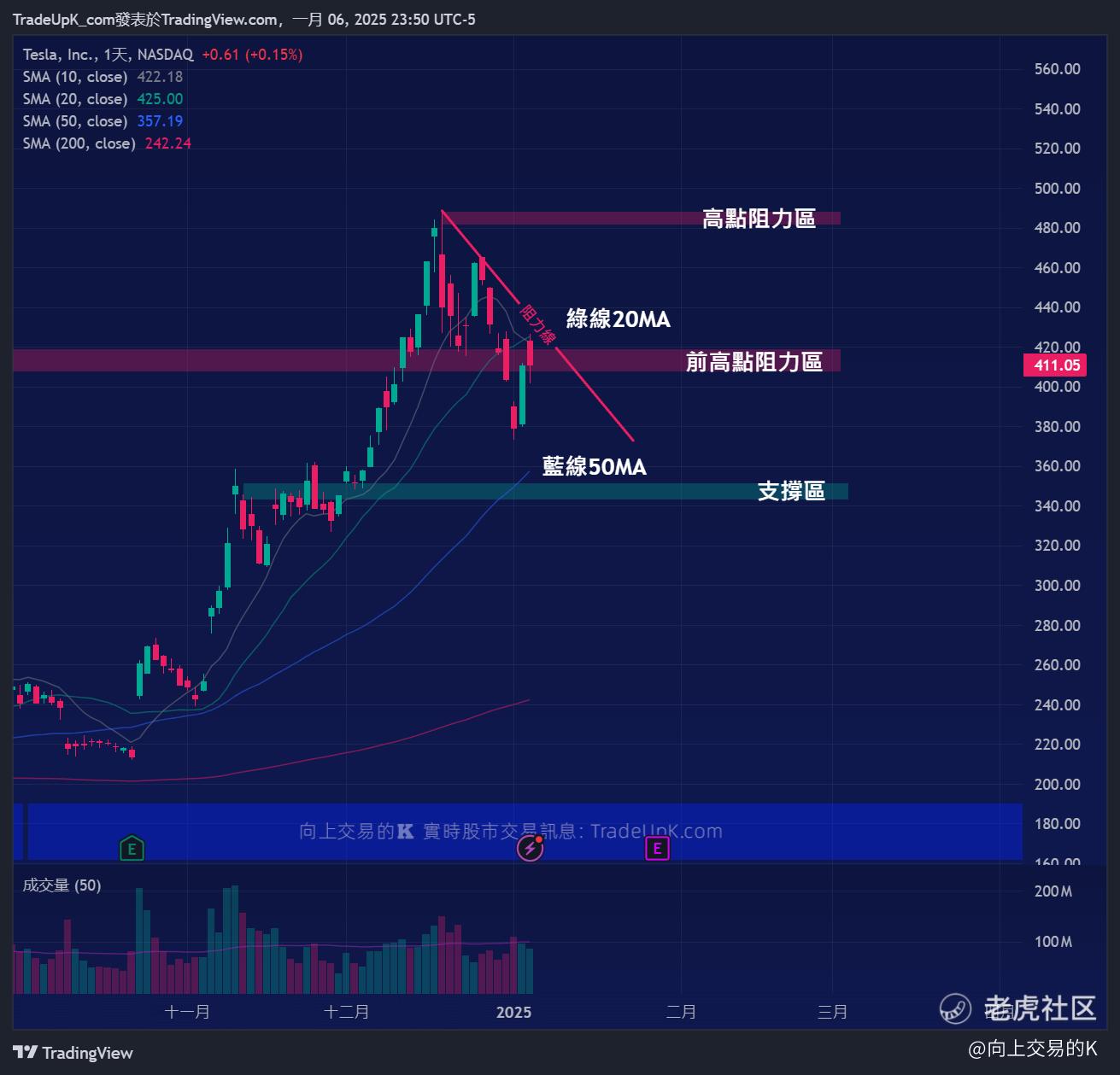 从昨晚图片来看,上涨的趋势被上方阻力线和上一个高点的阻力区阻挡,股价触碰20MA之后就往下走,说明市场大部分资金都很默契的没有看多TSLA,短期动能没有了,目前走出一个一浪低于一浪的图形结构。