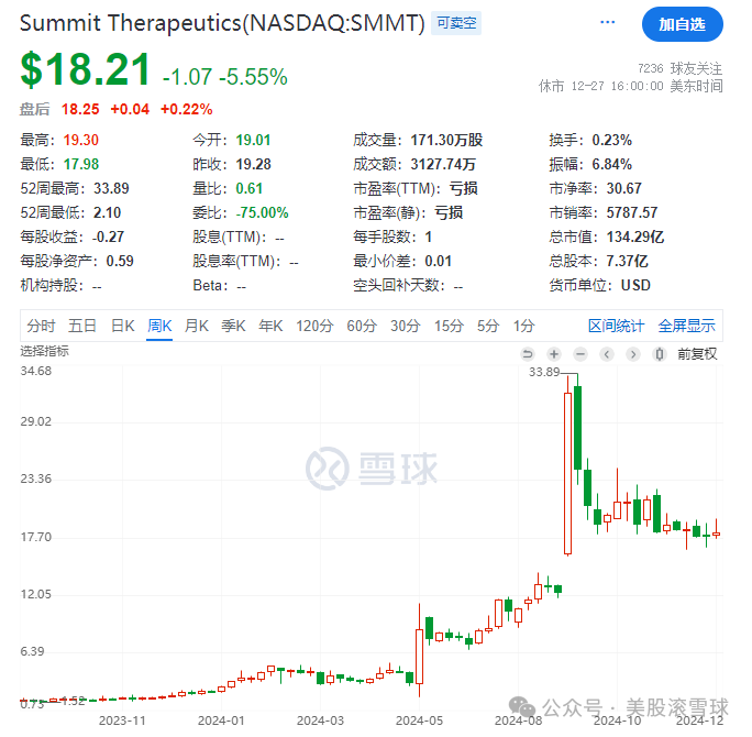 2022年12月,Summit获得康方生物PD-1/VEGF双抗依沃西的海外权益,不到两年时间,公司股价已经从0.785美元/股上涨到18美元/股,上涨了23倍。Summit也从一家市值仅6亿美元的小公司,变成市值130多亿美元的中型公司。