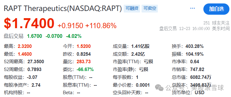 无独有偶,三天后,RAPT Therapeutics(NASDAQ:RAPT)宣布从济民可信引入单克隆抗体RPT904的海外权益,济民可信将获得3500万美元的首付款,以及最高可获得6.725亿美元里程碑付款及特许权使用费,RAPT当日股价暴涨110%+。
